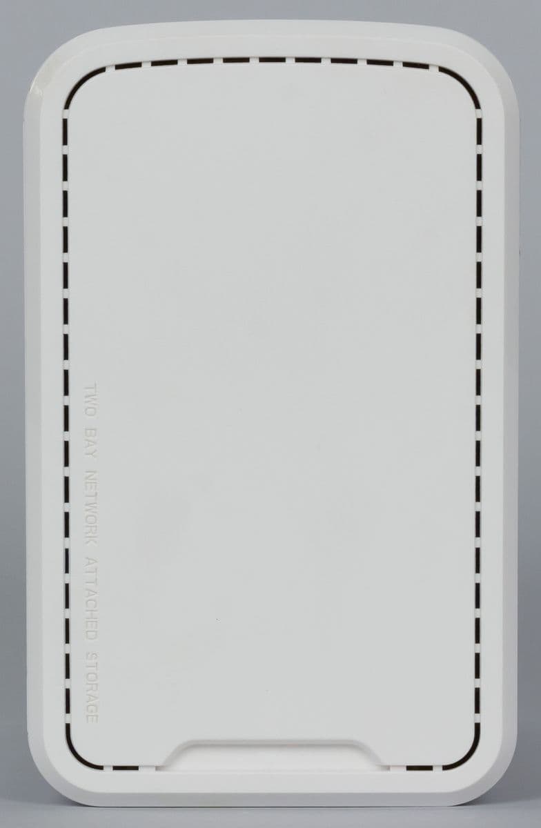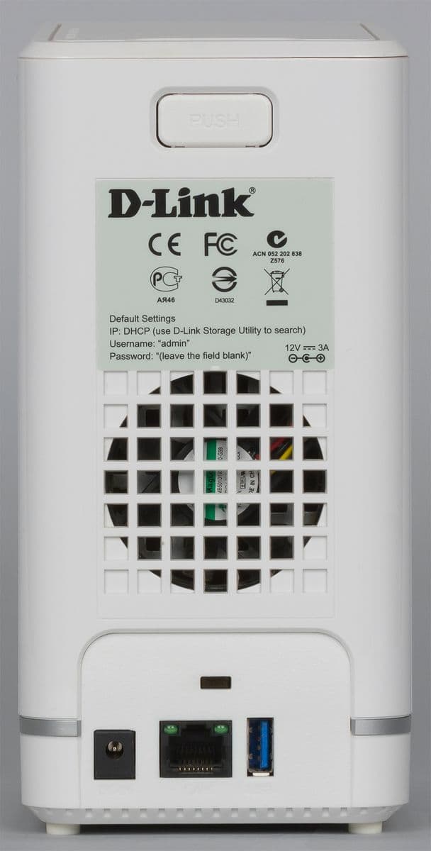 Для установки дисков пользователю нужно будет снять верхнюю крышку. Для этого используется крупная кнопка на задней панели. Ниже находится еще одна наклейка с данными для входа в интерфейс управления и параметрами блока питания, решетка вентилятора системы охлаждения, отверстие кенсингтонского замка, вход блока питания, гигабитный сетевой порт с индикаторами и порт USB 3.0. Отметим, что доступные снаружи элементы разъемов черные, что несколько портит внешний вид. Кроме того, порт USB установлен слишком близко к сетевому порту, что не очень удобно.
