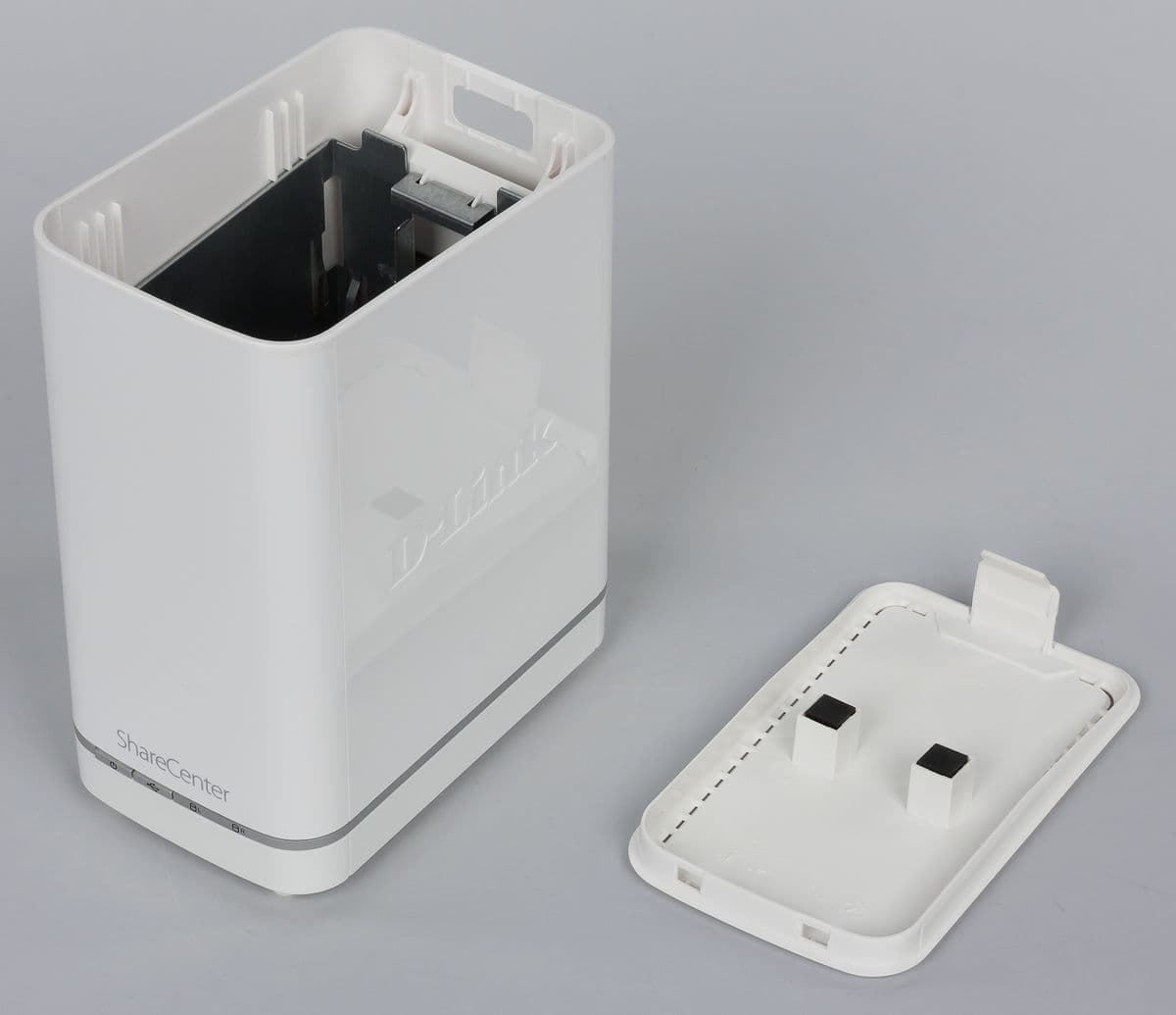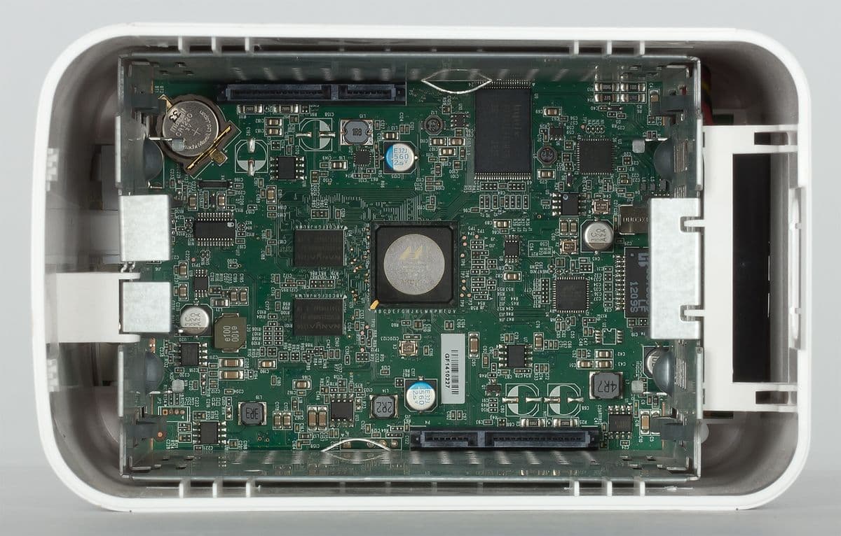 Внутренняя конструкция устройства достаточно простая — отсек для установки дисков (в вертикальной ориентации) представляет собой металлическую раму. Под ней установлена единственная печатная плата устройства.