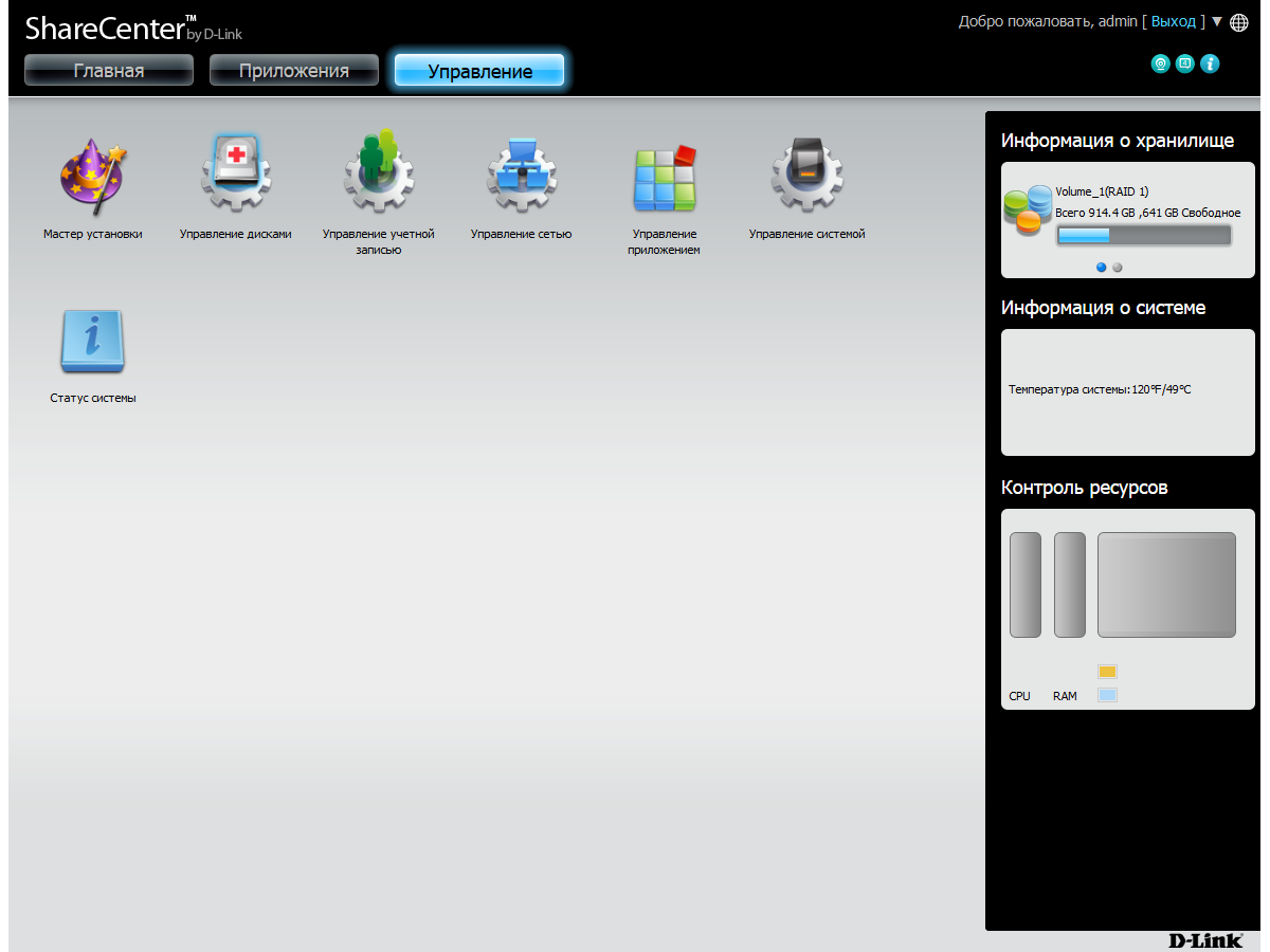 Веб-интерфейс имеет расширенный относительно традиционного формата дизайн. В верхнем правом углу есть элементы для перезагрузки и выключения устройства, а также для изменения языка интерфейса. В правой части страниц представлена информация о дисковых томах, системе и потреблении ресурсов процессора и оперативной памяти. Можно вывести здесь и журнал событий. А при открытии страниц с настройками, этот блок переключается на встроенную справочную систему.
