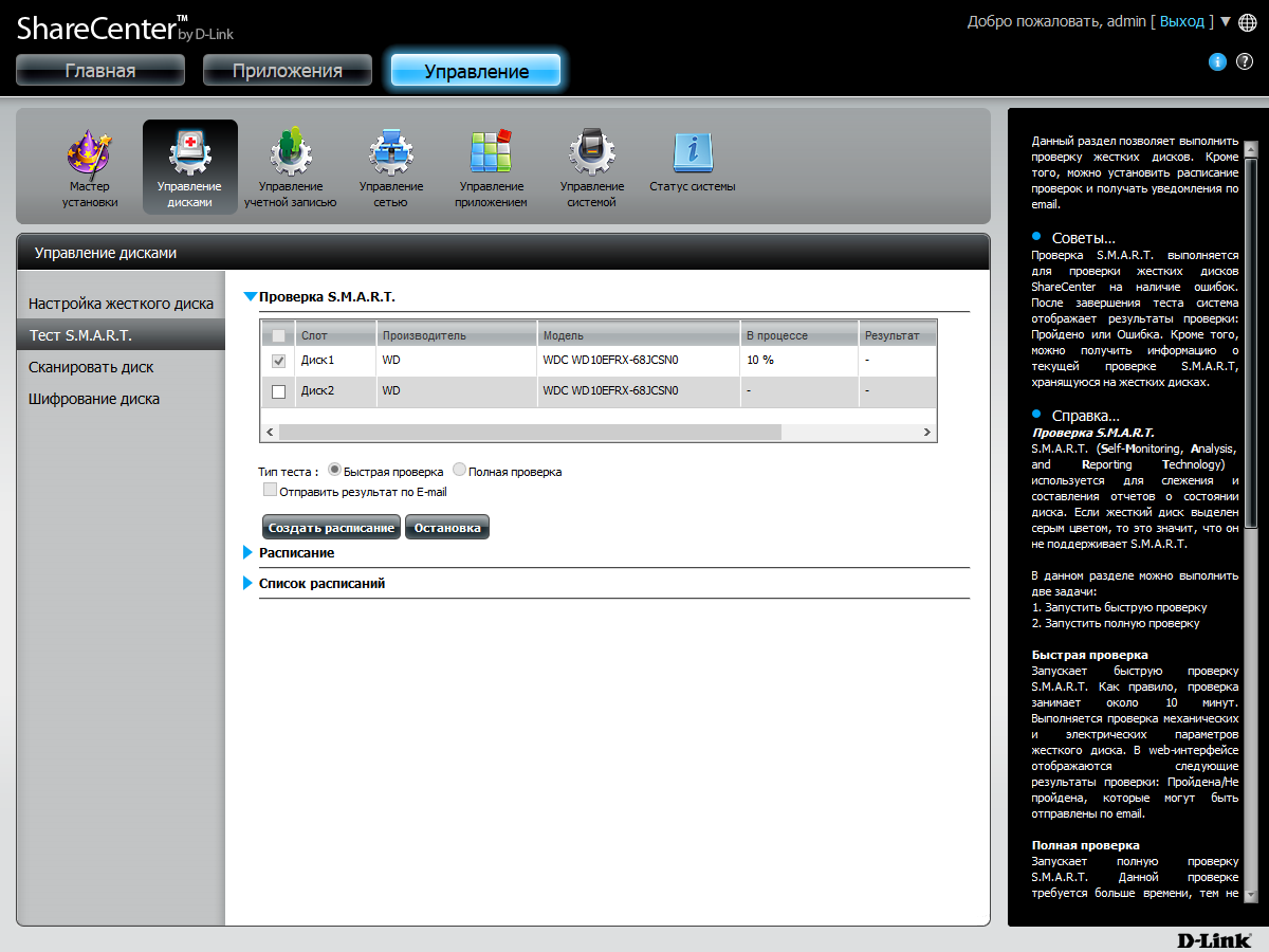 Из дополнительных операций предусмотрено сканирование файловых систем томов, а также тесты дисков по технологии SMART (в том числе и по расписанию).