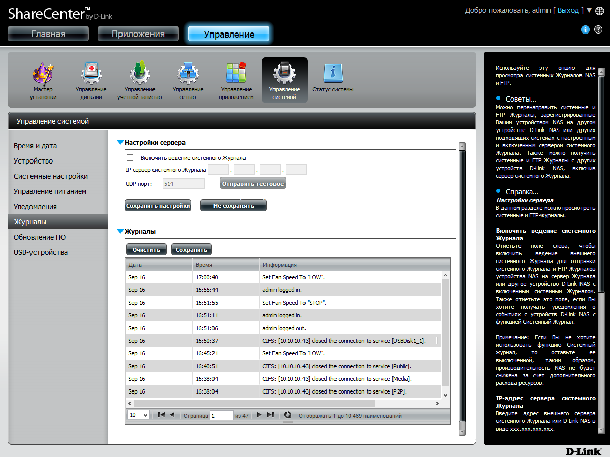 Накопитель ведет журнал событий простейшего формата без поиска и фильтров. Предусмотрена отправка информации на сервер Syslog, а также администратору по электронной почте или SMS (через внешний платный сервис).