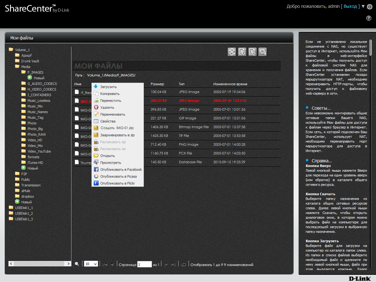 Третий вариант — «Мои файлы» — уже не имеет дополнительных функций связанных с форматами мультимедиа, но предоставляет возможности управления файлами любых типов, включая загрузку и скачивание, копирование и перемещение, удаление и работу с архивами.