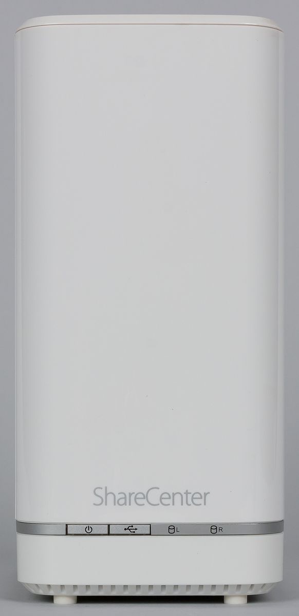 Еще один элемент дизайна — тонкая серая полоска в нижней части корпуса. На ней спереди находятся две кнопки (питание и отключение USB-накопителя), а ниже — четыре многоцветных индикатора (питание, статус USB, состояние и активность жестких дисков).