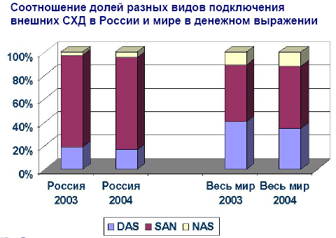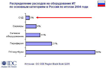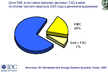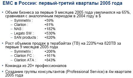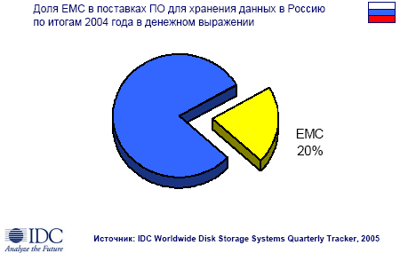 по результатам девяти месяцев 2005 года доля СХД, проданных под маркой EMC2, составила 27% от общих объемов продаж на российском рынке в денежном выражении. Еще большую долю EMC традиционно занимает в перспективном сегменте SAN (Storage Area Networks).