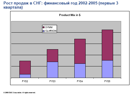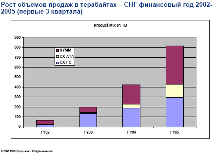 Достигнут огромный рост объемов продаж по ATA-решениям — более 800%! Это системы от Clarion. Пользуется большим спросом совместное использование систем ATA+FC. Большой рост наблюдается и по решениям Symmetrix, а по Clarion в целом рост чуть меньше. То же по терабайтам — здесь наблюдается даже более чем экспоненциальный рост: