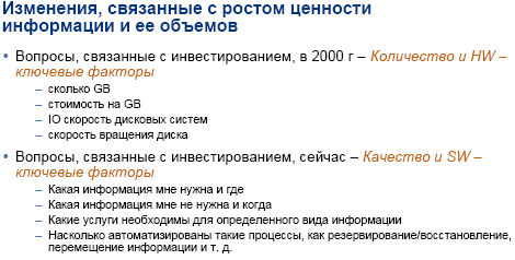 Этому росту способствует не только лавинообразное увеличение объемов данных у организаций и конечных пользователей, но и требования соответствовать законам (legal compliance) правительств многих западных стран для организаций хранить в течение долгого времени и выдавать по соответствующему официальному запросу данные, накопленные за время деятельности. Более того, теперь и наши компании, выходящие на западный рынок, и биржи должны соответствовать этому требованию. Кстати, у нас в стране тоже есть требования в ряде случаев хранить информацию в течение достаточно долгого времени.