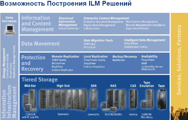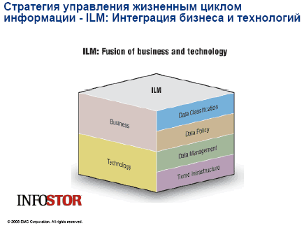 Интересно, что, по словам сотрудников российского EMC, разговоры с клиентом за последнее время сильно изменились — раньше было: сколько стоит железка, IO-скорость, все было о железе и технике. Сейчас же, когда речь идет о больших проектах, есть концепция ILM — клиент понимает, что большой объем информации можно тратить на разные нужды. Речь идет о бизнесе, о системе, а не индивидуальном модуле. Как это будет работать, как управлять, как обучить людей, и пр. Именно на это и направлена разработанная в компании концепция ILM.
