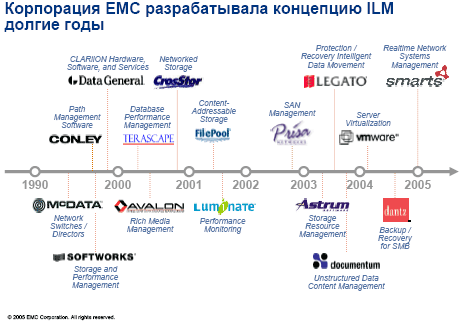 Приобретая большое число компаний и расширяя диапазон своих решений, в 2005 году EMC продолжила планомерное развитие от «компании по управлению и хранению информации» к «поставщику открытой информационной инфраструктуры». Так приобретение компании Smarts позволило EMC сформировать надежную стратегию по управлению исследованиями; покупка компании Rainfinity, ведущего поставщика системы NAS и решений по виртуализации файловой системы, и компанию Acartus, ведущего поставщика решений по оперативному учету, а также объявление о намерениях приобрести компанию Captivia Software позволит корпорации обеспечить более высокопроизводительные решения по управлению содержанием предприятий.