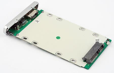 Разбирается модуль так же: откручиваем два винта и вынимаем основную плату с жестко прикрепленным к ней «активным» торцом. Плата интереснее. Хотя, на первый взгляд, такая же, как и раньше, — только РАТА-разъем (44-х контактный) заменен колодкой с двумя SATA-разъемами: интерфейсным и питания. Сложностей это не вызывает, хоть их и два — расположение разъемов одинаково на всех мобильных SATA-винчестерах. Соответственно, и сборка устройства выглядит, как и раньше: кладем винчестер на плату, «вдвигаем» в разъем, фиксируем двумя входящими в комплект болтиками. Но не будем спешить с этим, а вначале внимательнее изучим плату.