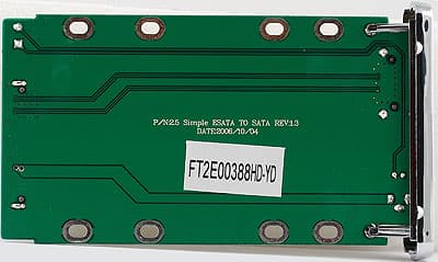 Тут сразу проявляются отличия от внешних моделей для USB- или FireWire-интерфейсов: активных элементов на плате нет. Один электролитический конденсатор, относящийся к линии питания, и все. Что логично — SATA и eSATA разъемы отличаются только физически, так что никакое преобразование интерфейсов не требуется. Да и для обеспечения питания нужно лишь подвести взятые с внешнего разъема +5 В, и все :) Таким образом, сами одностандартные eSATA внешние модули влияния на работу винчестеров оказывать не способны. Можно их производительность даже и не тестировать: это просто электрический переходник с одного типа разъема на другой, плюс корпус для защиты винчестера от внешних воздействий. А производительность в точности лимитируется лишь винчестером и контроллером, причем идентична той, которую мы получили бы при подключении того же винчестера к тому же контроллеру непосредственно (когда такое возможно). Поэтому то, что производитель делает упор на контроллер, а не на сам внешний модуль, вполне объяснимо.