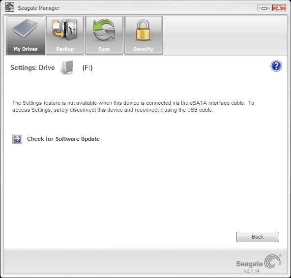 А вот с настройками произошел облом — использование eSATA для изменения их невозможно. То же самое касалось и FreeAgent Pro, так что мы не удивились, но надежда на лучшее все равно оставалась. Все, что мы можем — проверить наличие обновлений, чего после неудачного опыта как-то делать не хотелось :) Что ж — отложим пока выяснение этих возможностей программы/накопителя, и посмотрим, что еще нам доступно.