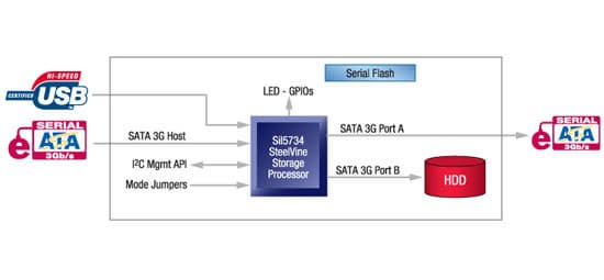 Достаточно интересное компактное одночиповое решение, предназначенное для однодисковых накопителей. Поддерживается два «наружных» интерфейса — и USB 2.0, и eSATA, что позволяет использовать их без каких-либо дополнительных аппаратных ухищрений. Винчестер всегда подключен именно к чипу, в отличие от ранее рассмотренного накопителя от Floston. Там поддержка eSATA реализовывалась при помощи дополнительного коммутатора и механического переключателя: в одном положении винчестер «напрямую» выходил на eSATA-разъем, в другом же он подключался к мосту JMicron JM20337 для реализации интерфейса USB 2.0. Подобная схема свойственна не только упомянутому устройству, но и всем накопителям на базе JM20337; при использовании же SiI5734 или JMicron JM20336 необходимости в ней нет. Пусть и ценой отказа от РАТА, но для накопителей на базе 2.5 дюймовых винчестеров смысла в ней нет: универсальные (с точки зрения внутреннего интерфейса) внешние модули чисто технически реализовать не получится. А от JM20336 SiI5734 отличается поддержкой двух каналов SATA, что позволяет в дальнейшем «наращивать» емкость внешнего хранилища, продолжая использовать всего один eSATA или даже USB-порт компьютера. В рассматриваемом сегодня накопителе это не реализовано, благо, опять же, в данном классе накопителей не востребовано, а вот стекирование внешних винчестеров на 3.5″ дисках уже более интересно :) Соответственно, как оно работает на практике, мы при появлении таковой возможности обязательно проверим. Пока же изучим работу данного моста в самом простом варианте использования, который как раз и реализован ViPower.