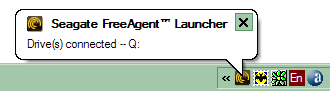 Допустим, эту операцию мы выполнили. Запускаем инсталлятор FreeAgent Tools, который нам все и установит. После этого потребуется перезагрузка, после которой начнется автоматически настройка AutoBackup (который устанавливается основным инсталлятором). Кроме этого, в системной области панели задач мы получаем значок Launcher, который нам всегда подскажет, под каким именем монтировался наш накопитель (и подключен ли он), а также позволит получить быстрый доступ к основным функциям утилит.