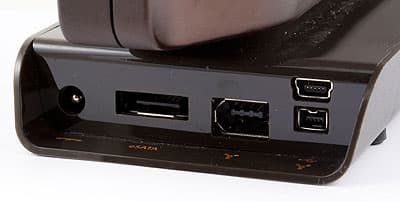Итак, как уже можно понять из вышесказанного, «активная составляющая» накопителя сосредоточена в подставке. Немудрено, что и все разъемы располагаются на ее заднем торце. Последних достаточно много — все-таки поддерживаются целых три интерфейса. Самый левый разъем предназначен для подключения блока питания. Рядом с ним — стандартный разъем eSATA. По соседству — выходной разъем FireWire 400: поскольку портов этого типа в современных компьютерах не так и много (обычно один-два), компания предусмотрела возможность соединения устройств в цепочку, благо стандартом это поддерживается. А в самой правой части подставки друг под другом расположены разъем USB типа mini-B и «маленький» 4-контактный порт FireWire, через который при необходимости устройство и подключается к компьютеру.