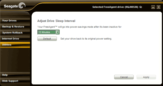 Период неактивности, после которого накопитель переходит в спящий режим, выбирается достаточно гибко: 3, 5, 10, 15, 30 минут, 1, 2, 3, 4, 5 часов или никогда. Значением по-умолчанию является 15 минут, что достаточно удобно для постоянно используемого компьютера, но если вы допускаете в работе достаточно длительные паузы, вполне разумным будет временной интервал увеличить.