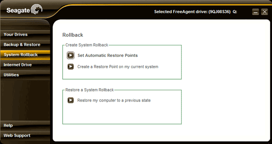 Следующая закладка позволяет управлять точками восстановления. Подобный механизм давно уже встроен в Windows, однако, как это обычно бывает, штатные средства ОС достаточно примитивны — фактически без дополнительных ухищрений мы можем лишь «откатить» систему к последнему успешно работающему состоянию. Сторонние утилиты (в частности, предлагаемая Seagate) работают более гибко. Точку восстановления можно создать вручную в любой момент времени или включить автоматическое их создание через определенные моменты времени (возможен интервал в от 4 до 24 часов с шагом в 4 часа), а в последующем — восстановить систему по состоянию на любой день, выбрав соответствующую точку. И, разумеется, дополнительную надежность обеспечивает хранение точек восстановления на внешнем (по отношению к системе) дисковом устройстве. Аналогичную функциональность обеспечивает Time Machine, появившаяся в последних версиях MacOS, в данном случае нам не нужно для ее получения переходить на совершенно другую операционку — все функционирует даже под управлением «старушки» Windows XP, которой уже больше шести лет.