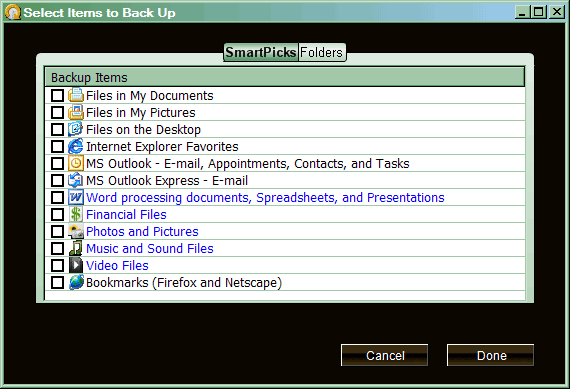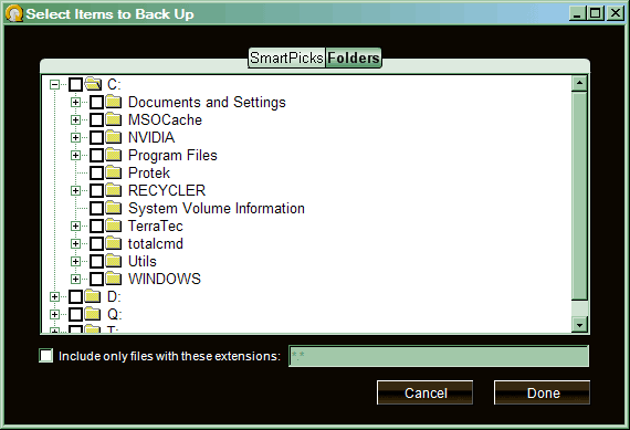 Несколько большую гибкость дает непосредственный выбор каталогов, которые необходимо бэкапить. В данном случае мы полностью управляем процессом, настраивая его на любые нужные файлы или даже на все, хранимые в определенной папке или на целом диске, в то время как SmartPicks довольно ограничен — например, данная утилита «не знает» почтовых программ, за исключением Outlook/Outlook Express, и в принципе «не знакома» ни с одним форматом архивов, так что хорошо подойдет лишь для «начинающего» пользователя.