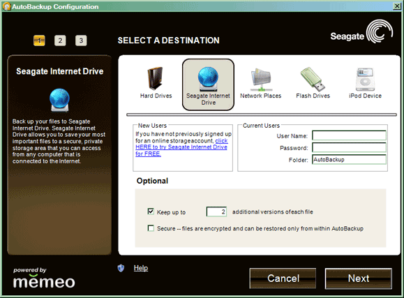 Одним из провайдеров данного вида услуг является как раз Memeo, предлагающая сервис, под названием Internet Drive. Попробовать его можно совершенно бесплатно — на один месяц вам будет выделен раздел, емкостью 500 МБ. Если ввести на специальной странице серийный номер AutoBackup, то те же 500 МБ вы получите уже на 6 месяцев. А дальше — за деньги. Впрочем, уже в больших объемах: тарифная политика достаточно гибкая, так что компания может предложить вам от 1 ГБ за $20 в год (вполне подходит для удаленного хранения важной персональной информации — ее не так часто бывает больше гигабайта), до внушительных 50 ГБ за $500 в год (а это уже будет интересно даже небольшой фирмы) с большим набором промежуточных опций. Конечно, передача данных по открытым каналам связи небезопасна, но для решения этой проблемы отлично подходит шифрование, которое AutoBackup умеет делать прозрачным образом.