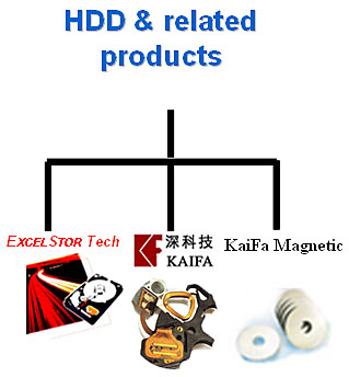 среди которых отдельной категорией значатся жесткие диски (производимые Shenzhen ExcelStor Technology) и компоненты для них — электромеханика и магнитные пластины (производятся соответственно компаниями Shenzhen Kaifa Technology и Shenzhen Kaifa Marnetic Recording, расположенными в той же промышленной зоне Kaifa Indistrial District).