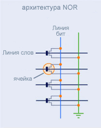 Устройство и принцип работы ячеек у нее такой же, как и у NOR. Хотя, кроме логики, все-таки есть еще одно важное отличие — архитектура размещения ячеек и их контактов. В отличие от вышеописанного случая, здесь имеется контактная матрица, в пересечениях строк и столбцов которой располагаются транзисторы. Это сравнимо с пассивной матрицей в дисплеях :) (а NOR — с активной TFT). В случае с памятью такая организация несколько лучше — площадь микросхемы можно значительно уменьшить за счет размеров ячеек. Недостатки (куда уж без них) заключаются в более низкой по сравнению с NOR скорости работы в операциях побайтового произвольного доступа.