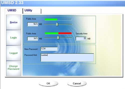 С открытой частью все просто. На две части устройство делится легко и непринужденно, точно так же, как в версиях 1.Х — выбираем их размеры, задаем пароль и подсказку для него, нажимаем кнопку ОК. Замечу, что минимальный размер каждой части составляет 1 Мбайт: открытой потому, что туда записывается сама UMSD (чтоб на другом компьютере доступ получить), закрытой потому, что при меньших размерах нечего и огород городить.