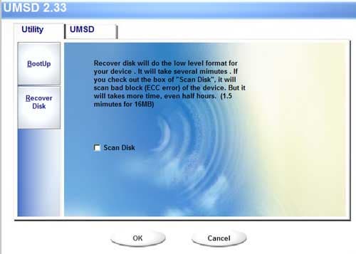 Куда более полезна возможность низкоуровневого форматирования устройства, предоставляемая по кнопке «Recover Disk». Можно просто отформатировать устройство (если, например, вы забыли пароль), а можно провести и тестирование для обнаружения сбойных блоков.