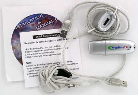 Разумеется, в данном случае потребуется кабель. Он в комплекте есть, причем длина «кабеля» гибко регулируется (как в рулетке). Еще в комплект входит инструкция и привычный уже CD с драйверами для Windows 98.