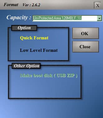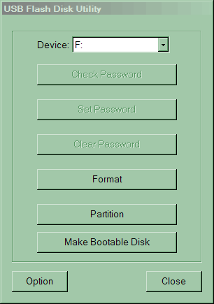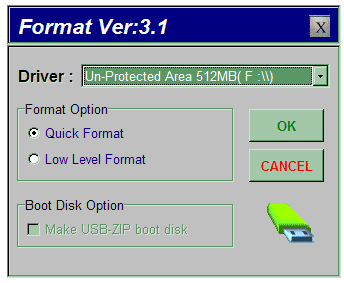 Накопитель она нашла, на выбор предложила сделать обычный или низкоуровневый формат (последняя возможность может оказаться крайне полезной), но вот под Windows XP возможность отформатировать флэшдрайв как загрузочный отсутствует. Под Win 9 x, очень может быть, что все работает, но этой системы у меня под рукой нет. Так что будем ждать пока KTC займется софтом :)