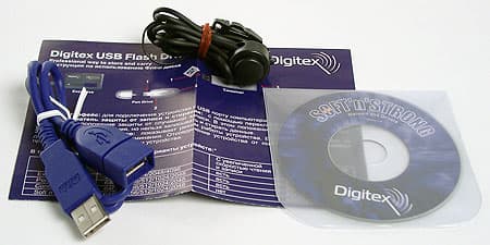 Комплект поставки прост и незамысловат: кроме самого устройства в него входят краткая бумажная инструкция, упомянутый шнурок для ношения накопителя на шее, USB-удлинитель (опять же — хорошо сочетающийся с устройством) и 3,5″ CD с драйвером для Windows 98 и утилитой-форматером. Последняя не требует установки и запускается откуда угодно.