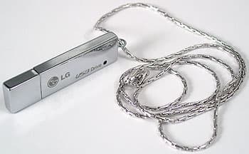 Крупный план. В общем-то, ничего принципиально нового в LG не придумали — классическая форма флэшдрайва и металлическая цепочка (вместо привычного шнурка) для его ношения на шее. Сам накопитель весьма компактный — 53×13,5×5 мм (то есть даже меньше, чем модели Gold и Mirror); 12 грамм, но этим сегодня уже никого не удивишь. А вот то, как устройство подается, блестящая находка маркетологов LG! Устройство приятно подарить любимой девушке (особенно если предварительно вытащить футляр из простенькой коробочки), его внешний вид вполне гармонирует с почти любой женской одеждой, в общем, наконец-то хоть кто-то действительно учел, что среди пользователей компьютеров встречаются не только мужчины, не на словах, а на деле.