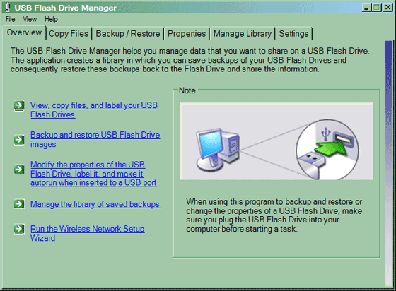 Первая закладка выполнена в модном ныне стиле «для домохозяек» и позволяет ознакомиться с возможностями приложения, разрешая прямо здесь выбрать конкретную. Трогательная забота — предупреждают, что для работы с накопителем хорошо бы убедиться в том, что он подключен. Причем даже в виде картинки — для домохозяек-прапорщиков, видимо :)