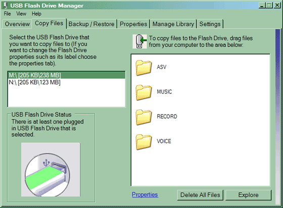Вторая закладка предназначена для копирования файлов. В левой части окошко со списком подключенных в данный момент UMS-устройств, при выборе конкретного в окне справа появится его содержимое. Далее просто берем нужный файл и переносим в правое окно. Чем данный вариант лучше, чем простой выбор накопителя в папке «Мой компьютер» с последующим перетаскиванием файлов я понять никак не могу.