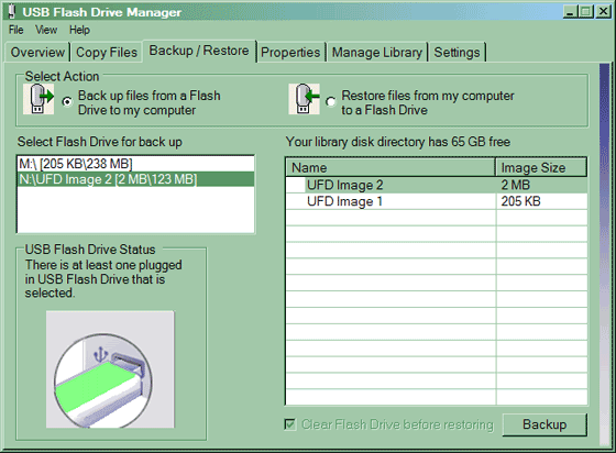 Третья закладка — то немногое, для чего программа может реально пригодиться. Несложно заметить, что с ее помощью можно легко выполнять резервное копирование и восстановление информации на флэш-накопителе. Причем резервная копия может быть не одна, а много — хоть после каждого изменения данных «снапшот» делай. С другой стороны, как-то я не замечал такого, чтобы на флэш-накопителе хранились уникальные данные: обычно они всегда есть и на других носителях, так что лишнее дублирование не нужно. Но из этого, по крайней мере, можно извлечь пользу. Но небольшую, поскольку сама операция крайне примитивна: в папке «Мои документы» создается соответствующая подпапка, куда файлы и копируются. Честно говоря, я могу эту операцию выполнять и без дополнительного софта. А если еще и каким-нибудь WinRar воспользоваться, так и результат будет лучше.