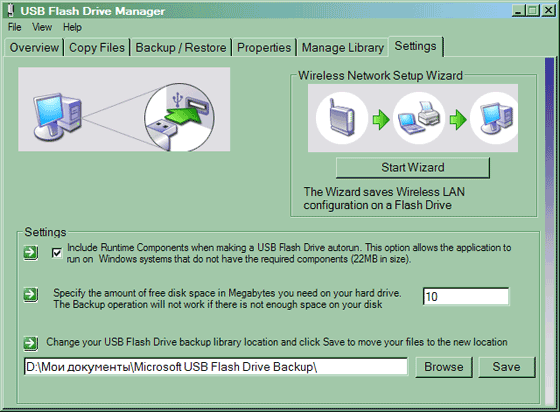 Шестая закладка настроечная. На ней можно задать путь к месту хранения резервных копий, а также установить минимальное количество места на соответствующем разделе жесткого диска (куда будут сохраняться эти самые «резервные копии») при которых процедура копирования будет работать. Обратите внимание на единственный чек-бокс: сама по себе утилитка небольшая, однако требует наличия установленного FrameWork. Если ее выбрать, то кроме копирования самой утилиты на флэш-накопитель для запуска оттуда (если вы, конечно, решите, что она заслуживает внимания) туда же с удовольствием поместится и весь дистрибутив FrameWork, так что лишитесь вы целых 22 мегабайт полезной емкости. Не смертельно, но в случае до сих пор активно используемых накопителей емкостью 128 или 256 Мбайт многовато. Единственная интересная возможность программы, притаившаяся на шестой вкладке, — сохранение конфигурации беспроводной сети на флэшке. Иногда может оказаться удобной.