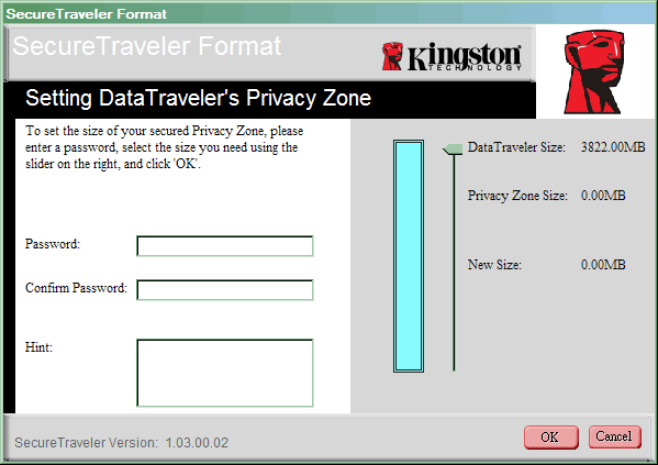 Не останутся обиженными и поклонниками повышенной функциональности — для удовлетворения их нужд в комплект устройства входят две программы. Первая, а именно SecureTraveler, предназначена для разбиения накопителя на две части — открытую и защищенную паролем. Обе «вешаются» на одну букву, так что одновременный доступ к ним невозможен: если пароль не введен, видим первую, введен — вторую. Защита простая парольная (шифрование данных удел более «серьезных» моделей, в ассортименте Kingston присутствующих), но и это лучше, чем ничего.