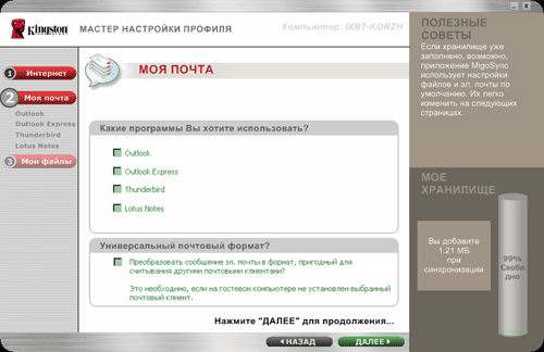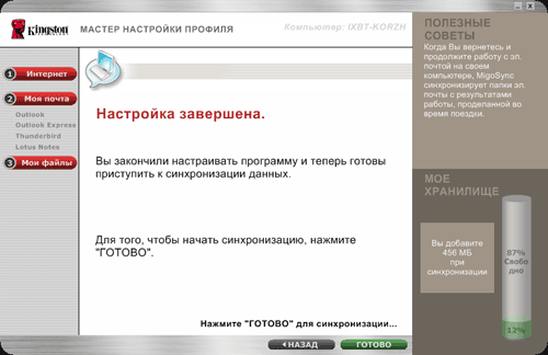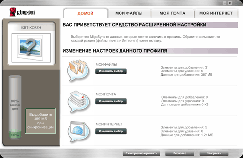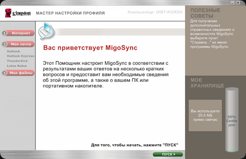 Второе приложение — MigoSync. Данную программу (точнее, первую ее версию) мы описывали два с половиной года назад, позднее встречались с ней прошлой осенью, сейчас же нам предлагают уже версию 3.1, существенно переработанную по сравнению с предшественниками. Вкратце скажу, для чего она предназначена: позволяет хранить на накопителе рабочие файлы, почтовую базу, настройки, избранное и историю интернет-браузера и т. п., и пользоваться ими на любом компьютере. Все вышеописанное тоже может быть взято с нескольких компьютеров, но друг другу мешать не будет. И, разумеется, удобные инструменты для синхронизации содержимого накопителя и соответствующего компьютера присутствуют. А более подробное представление о работе программы можно получить из приведенной ниже «галереи скриншотов» с комментариями.