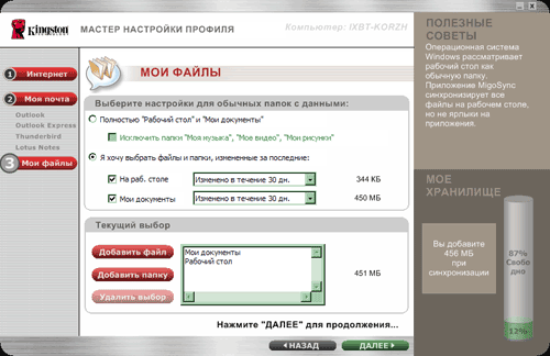 Кроме «Избранного» и почтовой базы, в профиль можно добавить и любые файлы, хранимые на компьютере.