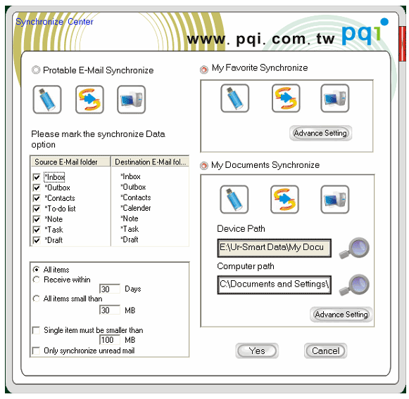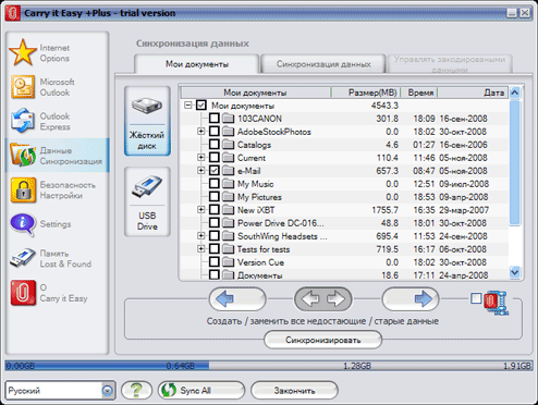 Как почтовые базы, избранное и файлы документов попадают на накопитель? Для этого предназначена небольшая кнопочка «Sync Center». Как и следовало ожидать, она открывает «Центр синхронизации». Последний позволяет осуществлять как односторонние операции (перенос информации с компьютера на накопитель или обратно), так и обеспечивать полноценную синхронизацию. Увы, но возможности программы несколько бедноваты по сравнению с утилитой от CoSoSys. Во-первых, несложно заметить, что синхронизация файлов данных ограничена всего одной папкой компьютера — собирать информацию из разных папок программа не умеет. Во-вторых, вся синхронизируемая информация хранится на накопителе в открытом виде — для шифрования с файлами приходится работать вручную. В-третьих, операции синхронизации выполняются исключительно вручную — никакого планировщика здесь нет.
