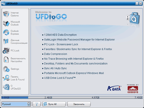 Где-то мы это уже видели и не раз, особенно логотипчик в правом нижнем углу :) Ну да — оригинальная программа имела название CarryItEasy+, написана компанией CoSoSys SRL, и подробно описана нами в конце прошлого года. Зато в случае покупки устройства от A-data полнофункциональная (а не существенно-упрощенная, как у Verbatim) версия программы, пусть и под другим названием, достается пользователю бесплатно (а не со скидкой, как у ATP и Verbatim). Утилита же, как мы уже писали, крайне мощная и полезная. За прошедшее время компания перешла с версии 2.0 на 3.0, основным отличием последней, на базе которой основывается и UFDtoGo, является функция PC-Lock.