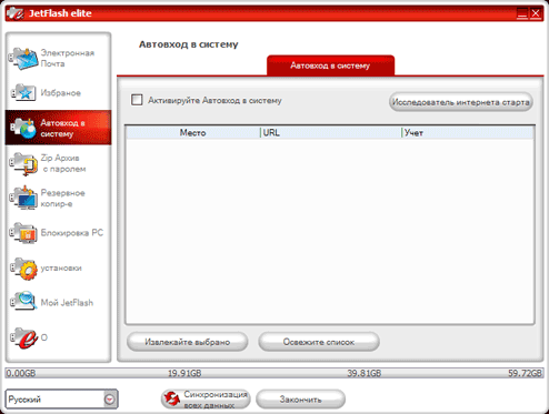 Новой для нас является только третья вкладка, появившаяся в CarryItEasy+ 3.0 вместе с блокировкой компьютера, но A-data «не доставшаяся». Несмотря на название, это не вход в систему, а «черный вход» на интернет-сайты. Забиваем в базу адреса и пароли и все — вручную их вводить не придется. Можно и забивать не вручную, а с соответствующих страниц кнопочкой сохранять. Но работает данная функция только с Internet Explorer. Попутно замечу, кстати, что перевод у «спецверсии» выполнен похуже, чем в оригинале — там перлов, типа «извлекайте выбрано» не отмечалось :)