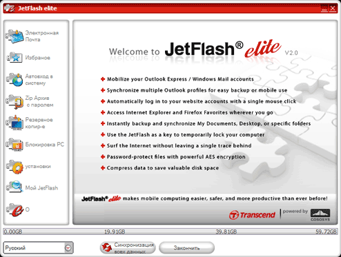 Впрочем, позаботились и о программном обеспечении, которое теперь называется JetFlash Elite. Но нас-то сменой названия не запутаешь — это все тот же модифицированный CarryItEasy+ от CoSoSys SRL. Изменений не так много. Положительное одно — используется шифрование по алгоритму AES с ключом 256, а не 128 бит. Отрицательных два — нет настройки резервного копирования по-расписанию (что для флэш-накопителя не критично), а также возможности сохранить на нем данные о владельце на случай утери (что поможет лишь если устройство найдет честный человек, который будет пытаться связаться с владельцем, а не прикарманит находку).
