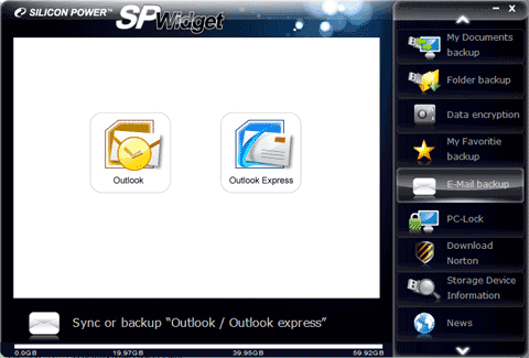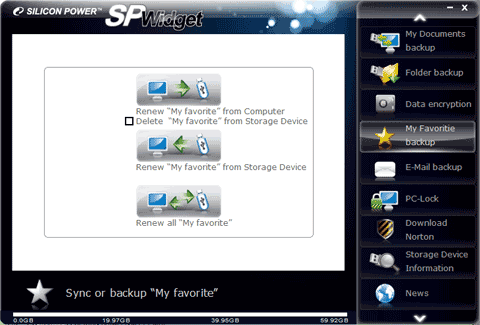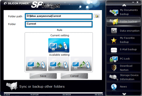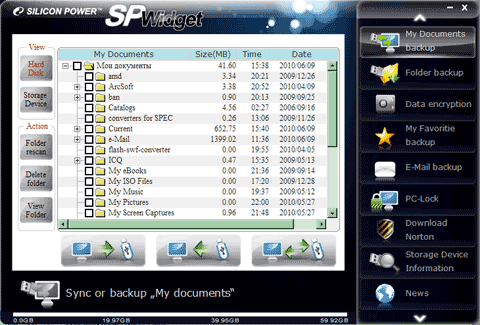 Седьмая кнопка всего лишь скачивает триальную версию Norton Internet Security 2009, а девятая — посылает пользователя читать новости на сайте Silicon Power, так что подробно мы ими заниматься не будем. Интерес представляет кнопка номер восемь, демонстрирующая страничку с подробной технической информацией о накопителе и о том, что нам наработала программа — по всем специальным папкам выдается их емкость (что достаточно полезно, поскольку они скрытые, так что пользователь «обычной» квалификации до них в Проводнике не доберется) и дата последней синхронизации. Сколько свободного места осталось на устройстве, кстати, хорошо видно на любой из страниц SP Widget.