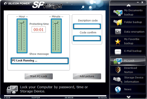 Шестая кнопка позволяет заблокировать доступ к компьютеру. Вариантов разблокировки три, из которых наиболее интересно использование флэшки в качестве аппаратного ключа.