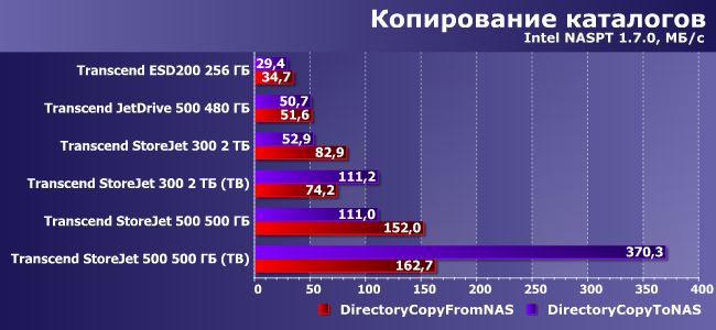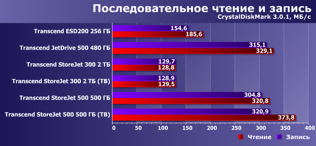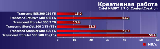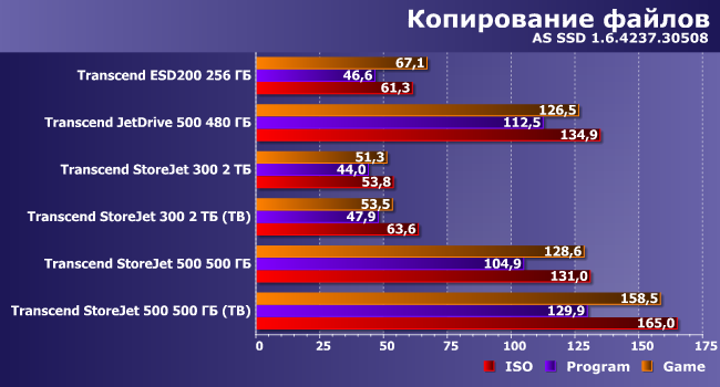 Мы думали, что и здесь StoreJet 300 проиграет всем, однако на практике его скорость оказалась сравнимой с ESD200, а в паре сценариев при использовании Thunderbolt он и вовсе вышел победителем. Это в очередной раз показывает, что для хранения и переноса больших объемов информации внешние винчестеры все еще конкурентоспособны — могут обгонять и флэшдрайвы, и даже некоторые внешние SSD временами. Но, как правило, старые и маленькие — новые модели заметно быстрее.