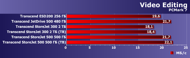Как видим, старый внешний SSD действительно старый и медленный — почти вдвое медленнее, чем современные устройства на новых контроллерах с поддержкой UASP. От последних получить 440 МБ/с (которые обещаны при чтении данных для StoreJet 500), не говоря уже о 570 МБ/с (максимум для JetDrive 500 при использовании SATA-интерфейса) нам не удалось, однако 300 с лишним мегабайт в секунду тоже неплохо — винчестеры столько не умеют. Что прекрасно видно по StoreJet 300, который проиграл всем — даже старенькому ESD200. И независимо от интерфейса, в то время как для StoreJet 500 использование Thunderbolt небольшое преимущество перед USB-подключением обеспечивает.