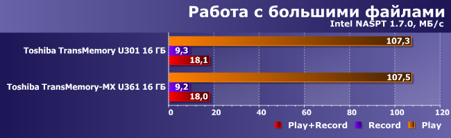 Отметим, что компания никак не афиширует использование в обоих накопителях одних и тех же контроллера и типа памяти — это уже определено нами «на месте». В принципе, «старшая» модификация внешне выглядит лучше, так что есть больше поводов выбрать ее и без упоминания о скорости, но U301 при этом несколько дешевле. В общем, выбор тут может быть однозначным только в том случае, если вам нужна модификация черного цвета: U301 таким не бывает. А как эти флэшки работают — покажут тесты. Правда, сравнение этих накопителей друг с другом можно было бы уже, пожалуй, и не проводить, после того как мы определили начинку, но нас-то интересуют и абсолютные цифры.