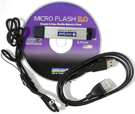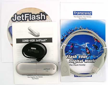 Комплект поставки по нынешним временам стандартный: накопитель, краткая инструкция, буклет по продуктам флэш-памяти от Transcend (им комплектуется все — от карт памяти, до картоводов), USB-удлинитель, CD с драйверами и утилитами и шнурок для ношения накопителя на шее.