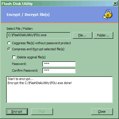 Переходим к правой кнопке главного меню, и что мы видим? В фирме решили, что простая парольная защита, использующаяся другими производителями, есть фиговый листок, ни от чего не защищающий. Поэтому в Flash Disk Utility встроили утилиту для сжатия и кодирования (можно и просто сжимать без кодирования) и обратного раскодирования любых файлов. Работает все очень просто — выбираем файл, вводим пароль, нажимаем кнопку, указываем каталог назначения и получаем там закодированный файл с расширением PKM. Можно выбрать сразу целый каталог — сожмут и упакуют его весь. Ну а если выбрать PKM-файл, то кнопка Encrypt меняется на кнопку Decrypt, что позволяет нам легко выполнить обратную операцию. Замечу еще, что примитивный инсталлятор сервисных утилит даже скорее благо — по сути, программа вообще не требует инсталляции, так что ее можно всегда носить с собой на самом флэшдрайве и оттуда же и запускать. В результате можно ничего не устанавливать на чужой компьютер, что, к сожалению, не выполняется для всех остальных накопителей из этого обзора — для работы с запоролированным накопителем придется устанавливать фирменное ПО. Солидный плюс устройству от JetLinx, не говоря уж о том, что шифрование это куда более надежная защита, чем обычный пароль.
