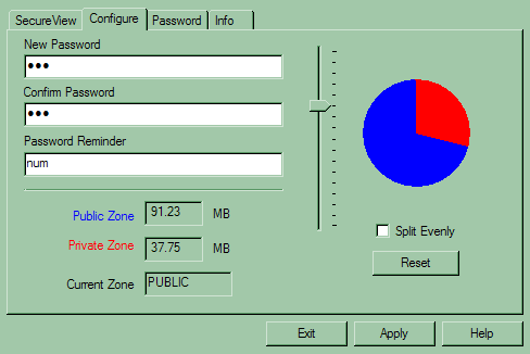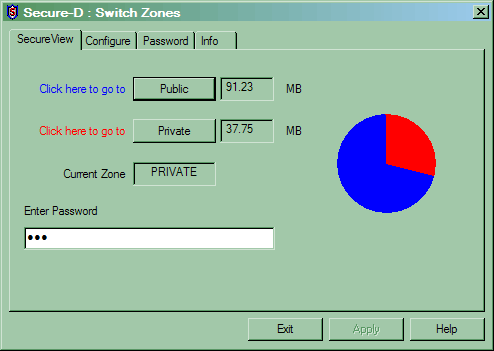 Утилита в комплекте достаточно интересная. Первая закладка нужна для переключения доступа к открытой и защищенной частям. Причем пароль достаточно ввести один раз, а переключение после этого осуществляется нажатием всего одной кнопки (при этом соответствующий раздел сразу же открывается в Explorer).