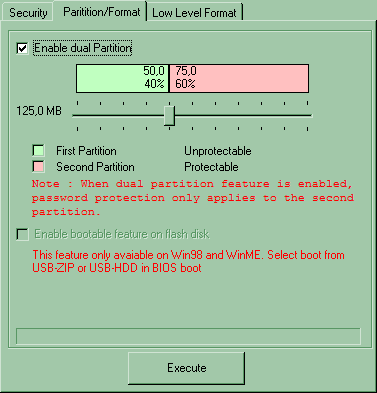Но паролировать весь объем флэшдрайва обычно нецелесообразно: к некоторым данным полезно иметь доступ и без ввода пароля, так что есть смысл разбить память на две части. Сделать это можно на второй закладке утилиты. Тут же можно отформатировать накопитель как загрузочный, но, увы, для этого необходимо воспользоваться компьютером с Windows 9x :(